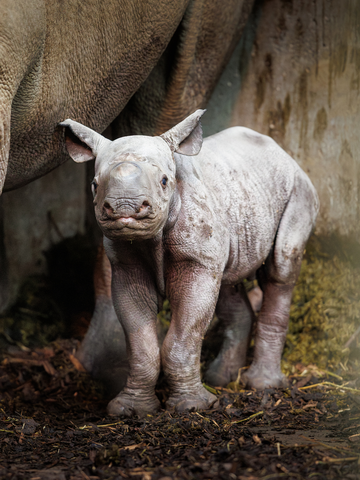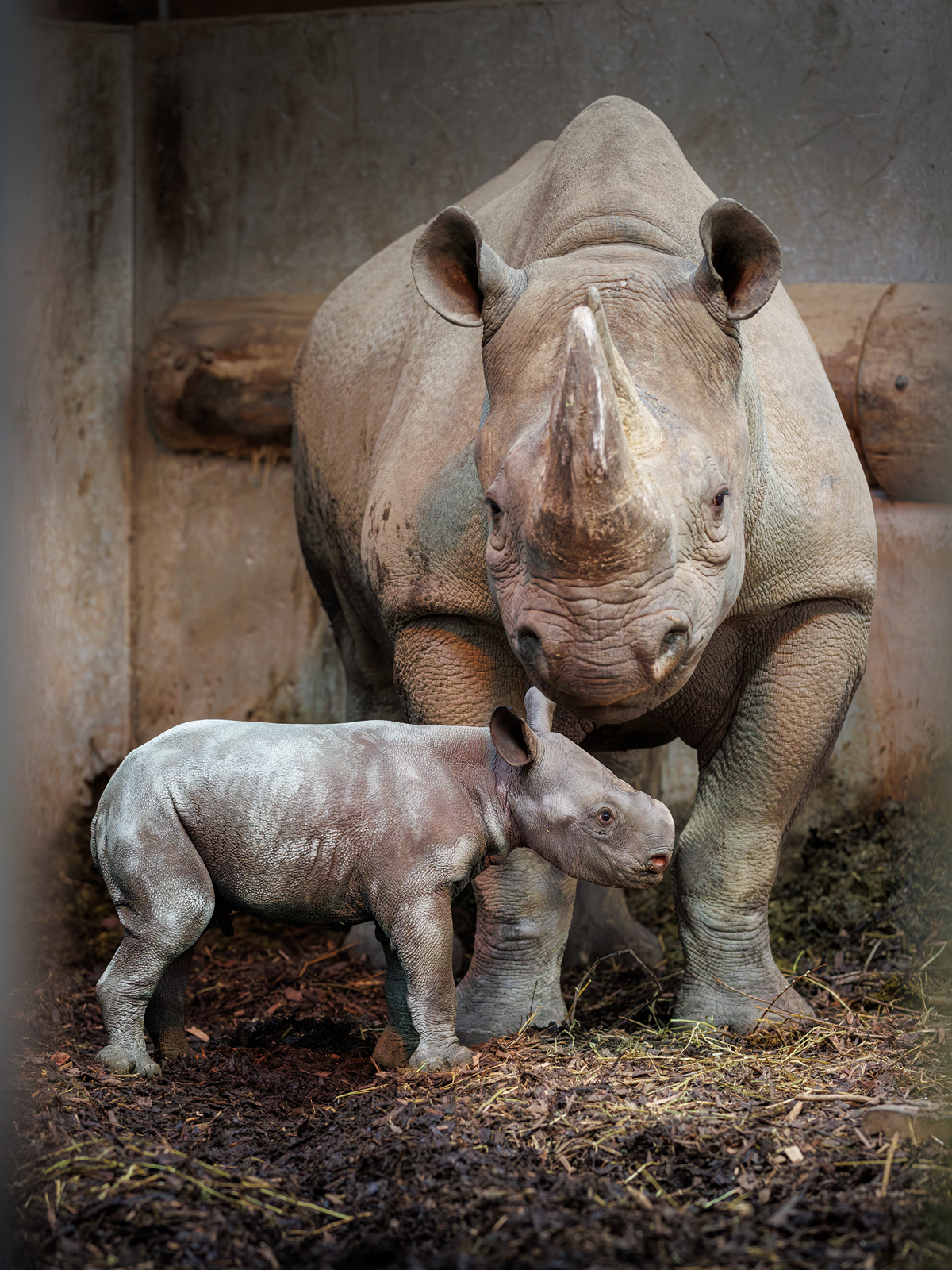 Eastern black rhinos are classed as critically endangered due to poaching and loss of habitat. There’s thought to be an estimated 1471 Eastern black rhino left in the wild and around 109 in zoos across Europe, including our newest addition. The calf made its appearance at 6.34am and within a couple of hours was standing up, following mum around the enclosure and had started suckling. All great signs!